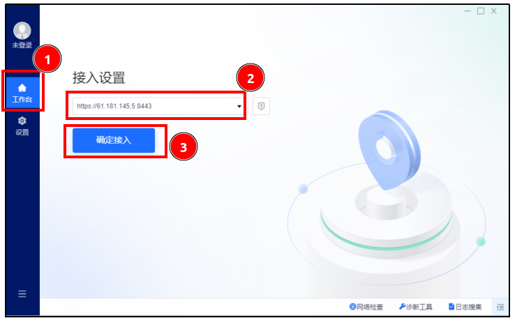 客户端软件安装完毕后。请运行软件,在接入设置框中填入:https://61.181.145.5:8443 然后点击“确定接入”。