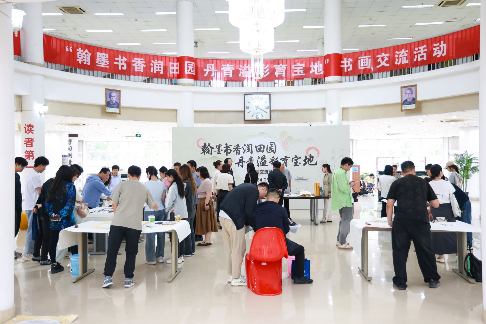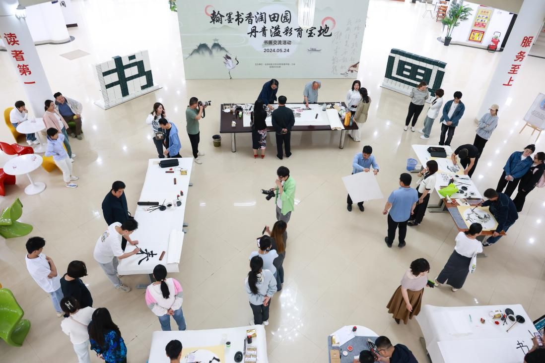 为了弘扬中华优秀传统文化,营造热爱国粹、热爱书画艺术的氛围,更好地推动校园文化建设,图书馆联合学院工会、宝坻区文化馆于5月24日下午在社科馆举办“翰墨书香润田园 丹青溢彩育宝地”书画交流活动。宝坻区文化和旅游局副局长张英、北京科技大学天津学院副院长兼财务总监王俊敏、北京科技大学天津学院党委副书记、工会主席郭雅娟、宝坻区文化馆馆长倪芳芳、宝坻区的书画家、文化馆工作人员、图书馆全体馆员以及学院书画爱好者200余人参加了活动。