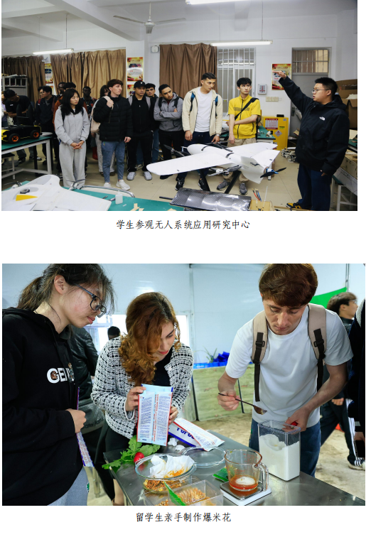 座谈会后,留学生参观无人系统应用研究中心,感受中国科技的飞速发展。在劳动实践教育活动中,留学生们亲手制作爆米花,到蔬菜大棚内进行拔萝卜、挖大蒜等劳动实践,体验中国田园生活的乐趣。在传统文化体验馆,留学生们试穿汉服,沉浸式体验茶道与书法,感受中国茶文化的宁静和谐,在我院学生的帮助下书写汉字,领略书法艺术的魅力。