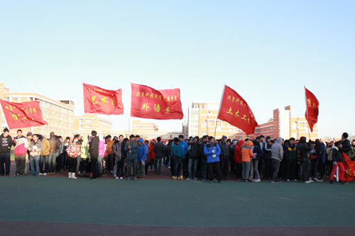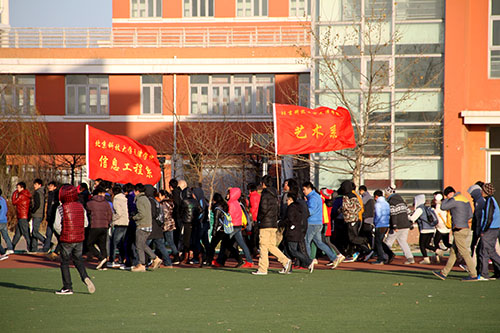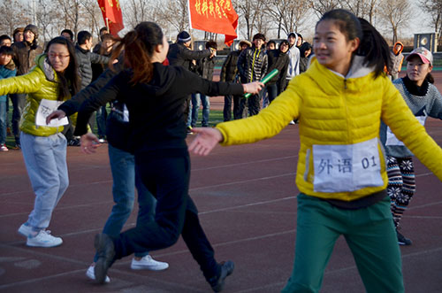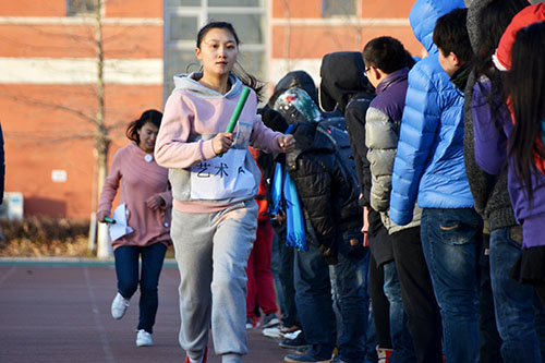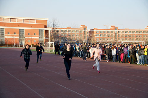 下午13::30,冬季长跑启动仪式正式开始,郭景文院长致辞并宣布北京科技大学天津学院2013年冬季长跑活动开始。一千余名同学绕操场开始长跑,拉开了我院学生冬季长跑活动的序幕。随后进行纪念一二.九运动长跑接力活动,来自学院各系的九支参赛队伍整装待发,每支参赛队由一名教师、6名男生和4名女生组成。在同学的助威呐喊声中长跑接力正式开始,第一棒由各系教师领跑前50米,之后接力棒交给各系代表队队员。经过近四十分钟的激烈角逐,土木系荣获第一名,艺术系获得第二名,管理系获第三名,材料系和外语系获得“精神文明奖”。