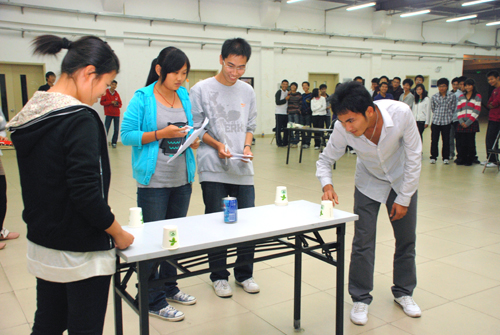 由材料科学与工程系、机械工程系学生组成的16只代表队参与了本次运动会。运动会共设有6个团体项目:乒乓球滚卷尺,气球吹纸杯,沙弧球,夹乒乓球,转球打易拉罐,垒苹果。以每只代表队完成任务所需时间进行排序,用时最少者为冠军队。比赛开始后,