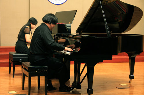 在中国第一首钢琴曲发表百年之际,由天津市音乐家协会、天津交响乐团、天津音乐学院等单位联袂推出的中国钢琴百年纪念系列活动《百年经典 盛世中华》——中国钢琴作品校园巡礼音乐会于12月2日晚6时30分在我院12教学楼艺术系弘艺音乐厅隆重举办。天津市教委体卫艺处副处长刘恒岳,天津市音乐家协会副主席、著名词作家朱胜民,天津交响乐团副团长刘文来,天津青少年活动中心副主任张大庆,天津市教育教学研究室音乐室主任李同全,北京科技大学天津学院党委副书记叶振楠,艺术系主任胡建华,艺术教育中心主任林碧芸等出席了本次晚会。
