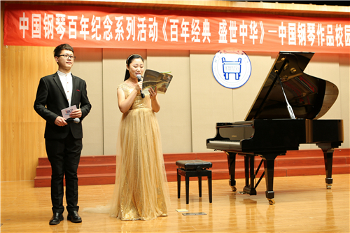 主持人杜晓静、王明明为观众介绍中国钢琴百年纪念系里活动