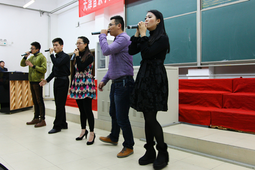 演出开始,12教阶梯教室座无虚席。在张鹏老师指挥,王欣老师钢琴指导下,我院学生艺术团合唱团首先带来曲目《praise his holly name》、《Black bird》以及为了纪念青海湖自行车赛而改编的《青海梦》,一首《故乡的亲人》合唱更是勾起观众的思乡之情。随后,“翼乐团”团员分别在接靓和任君的指挥下,伴着郭嘉辉和单思思老师的钢琴伴奏,带来了《Adiemus》、《不了情》、《I will follow him》和《Festival sanctus》等曲目,紧接着天津音乐学院“翼乐团”为观众奉上独具匠心的阿卡贝拉曲目《爱要坦荡荡》、《Moves like jagga》、《Venus》,我院学生艺术团也向观众们奉上了阿卡贝拉曲目《Stand by me》、《爱你在心口难开》,《I sing you sing》,令在场观众热血沸腾,现场掌声不绝。天津音乐学院“翼乐团”阿卡贝拉女团作为除北京现代音乐学院第一支阿卡贝拉女团外的新秀,给观众们又带来了阿卡贝拉曲目《看月亮爬上来》、《牵手》、《带我到山顶》、《因为爱情》,而“翼乐团”阿卡贝拉男团则献上了黄家驹的作品《海阔天空》,最后,“翼乐团”送上的压轴曲目《万物生》和《三天三夜》更把整个晚会氛围推向高潮。 一首首动听的曲目,带给观众精神上的享受和心灵上的洗礼,让全院师生领略到了合唱以及阿卡贝拉音乐艺术的无限魅力。