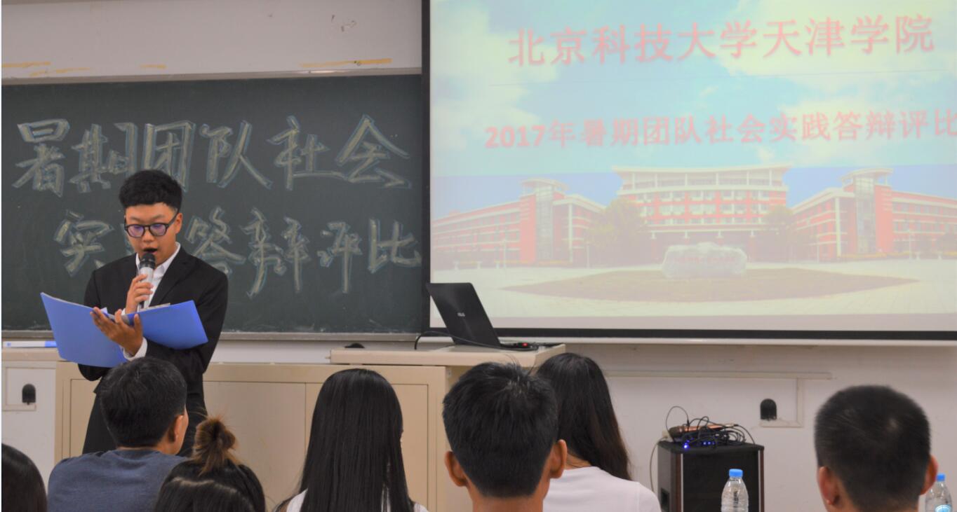 2017年9月26日18:30,在8教103举行北京科技大学天津学院暑假团队实践答辩评比活动。出席此次大会的有团委书记殷实、团委副书记王研、团委宣传部部长、外语系团委书记张添善、团委组织部部长陈筱、团委文艺部部长刘洋、团委科技部、青协主任林小茹、材料系分团委书记何欢欢、机械系分团委书记朱嘉阳、信息系分团委书记任兆欢、经济系分团委书记洪烨、管理系分团委书记查嫒嫄、法律系分团委书记孙超、艺术系分团委书记李洋、团委实践部部长、素拓主任赵怡。