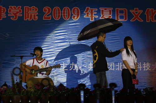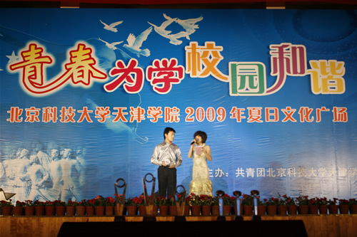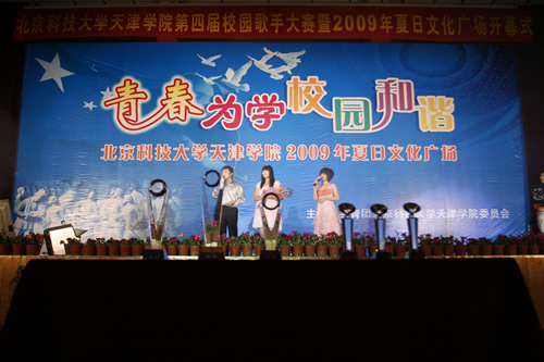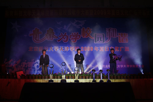 4月15日晚,第四届校园歌手大赛暨2009年夏日文化广场开幕式在体育馆隆重举行,本次比赛由共青团北京科技大学天津学院委员会主办、学生会承办。党委书记王斌、副院长曹连东、财务总监肖祖刚、学院办公室主任白亮、学生处处长盛佳伟、团委书记叶振楠及各系党总支书记出席开幕式并观看了比赛。