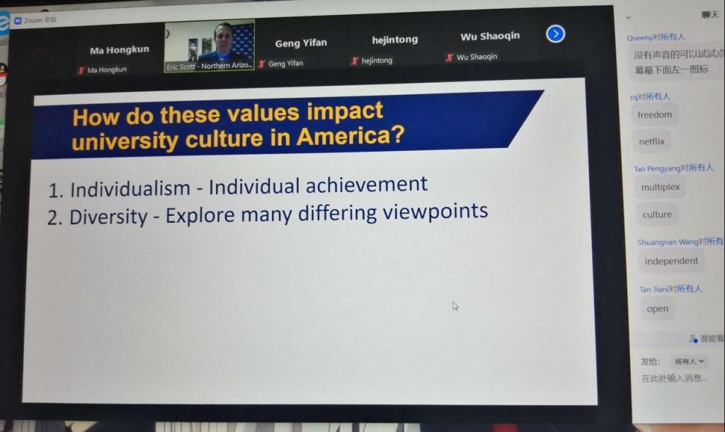 10月8日和15日,3044永利集团美国文化讲座之“我的美方大学第一课”活动在线上顺利举行。此次讲座,美国北亚利桑那大学英语强化项目主任Eric Scott为2021级新生讲授第一课《Exploring American Values & Life in the Southwest》,通过列举7个方面的美国价值观,阐述其对美国文化和生活的影响,并进一步介绍美国西南部和北亚利桑那大学的文化特点。
