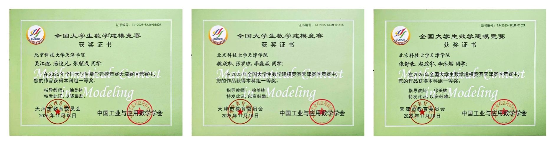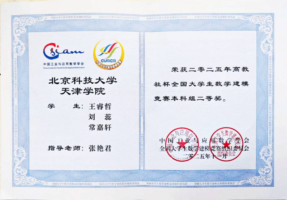 近日,由中国工业与应用数学学会主办的2025年“高教社杯”全国大学生数学建模竞赛成绩揭晓。我校参赛学生在本次竞赛中再创佳绩,共有8支队伍成功获奖,其中1支队伍荣获全国二等奖,3支队伍荣获天津市一等奖,4支队伍荣获天津市二等奖。具体获奖名单及获奖证书如下: