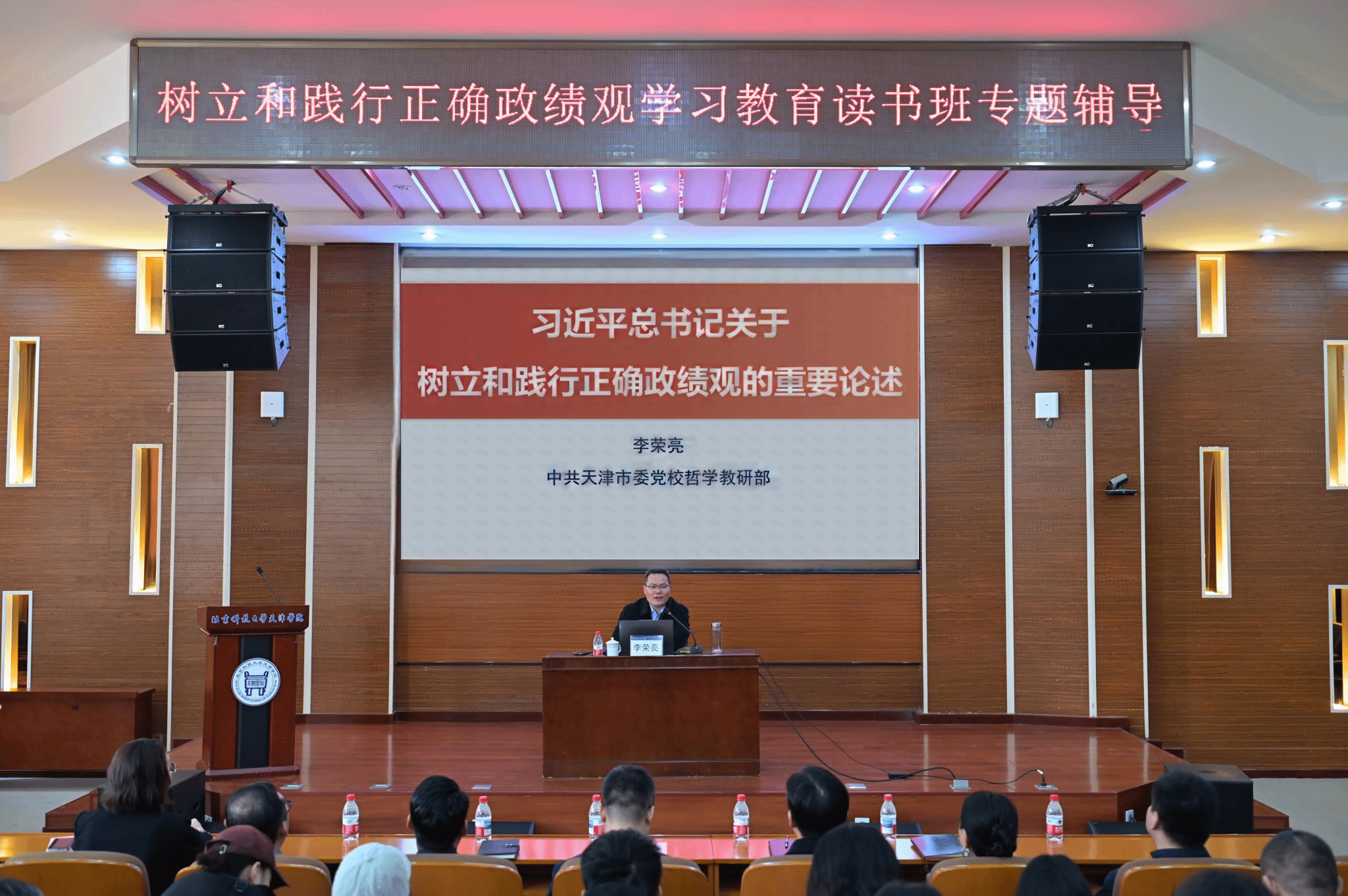 学院邀请天津市委党校哲学教研部副主任李荣亮教授进行专题辅导。李荣亮教授紧扣习近平总书记关于树立和践行正确政绩观的重要论述,围绕“政绩观问题是一个根本性问题”“政绩为谁而树”“树什么样的政绩”“靠什么树政绩”四方面,深刻阐明“立党为公、为民造福、科学决策、真抓实干”的总要求,引导党员、干部自觉践行为人民出政绩、以实干出政绩。