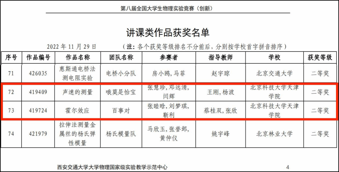 2022年11月29日,由国家级实验教学示范中心联席会物理学科组、全国高等学校实验物理教学研究会、教育部大学物理课程教学指导委员会大学物理实验专项委员会和中国物理学会物理教学委员会联合举办,西安交通大学物理学院承办的2022年第八届全国大学生物理实验竞赛成功举行,我院两支代表队在比赛讲课类赛道中荣获佳绩,两支队伍均获得二等奖的好成绩。