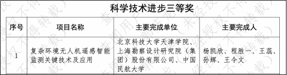 近日,天津市人民政府发布了《关于颁布2024年度天津市科学技术奖的决定》的通知,我院信息工程学院无人系统应用研究院杨凯欣教授主持申报的“复杂环境无人机遥感智能监测关键技术及应用”项目荣获科技进步奖三等奖。这是我院首次荣获天津市科学技术奖,也为建校20周年校庆献上一份贺礼。