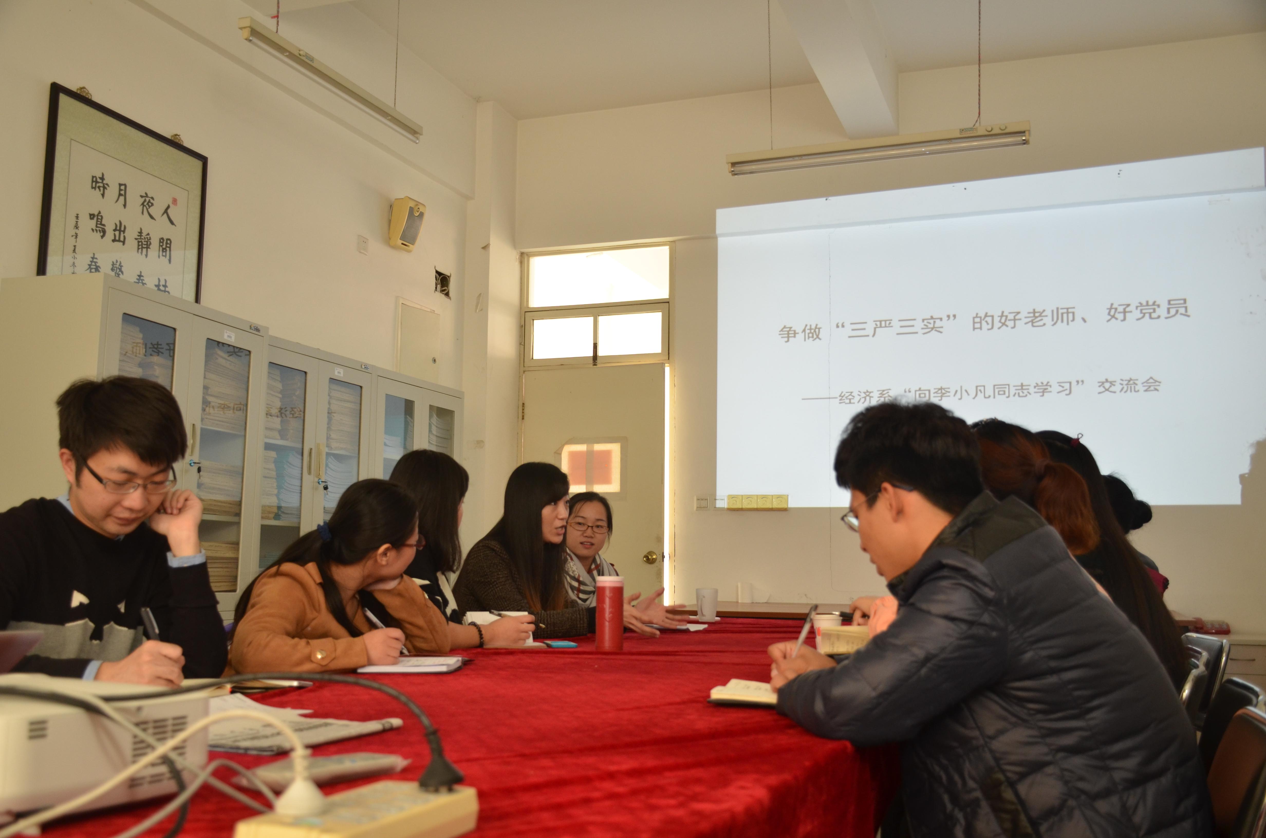 为发挥先进事迹激励作用,营造“三严三实”良好学习氛围,经济系全体教职工于2015年10月28日,在1教208会议室集体观看了李小凡同志先进事迹报导,统一学习了李小凡同志的感人事迹。