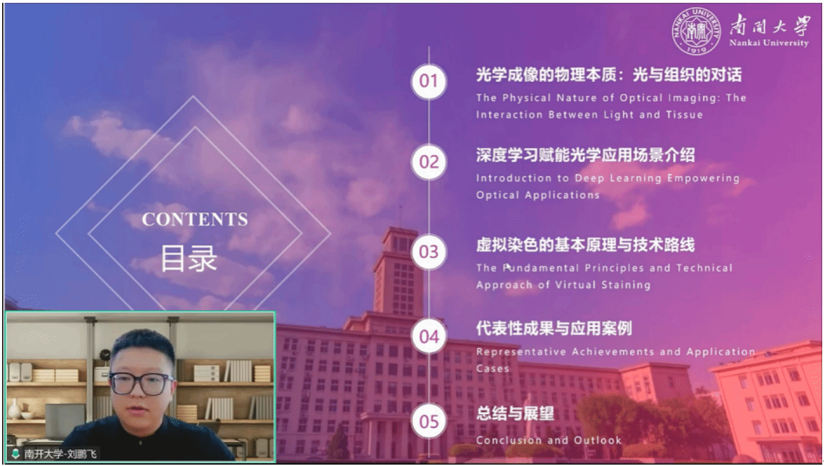 南开大学物理科学学院刘鹏飞以《当深度学习遇见光:AI赋能的生物组织虚拟染色新范式》为题,展示人工智能在生物组织虚拟染色中的前沿成果。他深入解析了AI如何模拟光学传播、组织散射等物理过程,实现无需化学染色的高精度组织成像,并展望了该技术在疾病诊断与治疗中的广阔前景。报告后,他与参会教师就虚拟染色技术的准确性及其临床应用的可行性进行了专业交流,为“AI+物理”交叉研究提供了新思路。