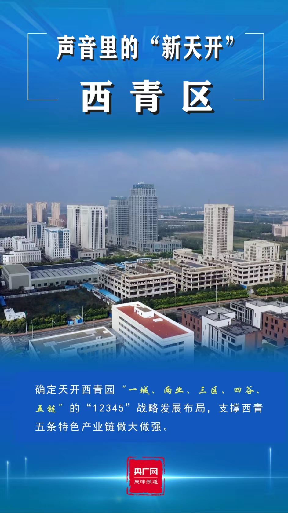 西青区结合区域情况,划定大学科技园6万平方米空间为起步区,划定近20万平方米空间为先导区,优先重点建设,为天开西青园整体高标准建设提供强有力的引擎带动作用,确定了天开西青园“一城、两业、三区、四谷、五链”的“12345”战略发展布局,即:建设一座天开西青科创城,发展新能源新材料和智能网联、生物医药和生命健康两大主导产业,强化创新策源区、成果转化区、科创服务区三区功能联动,打造智创谷、智能谷、生医谷、未来谷四大板块,支撑西青五条特色产业链做大做强。在园区实现从研发、孵化、培育、加速到转化、产业化的全链条跨区域空间布局。