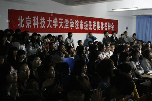 本次答辩采用参评班级和个人现场抽签决定答辩顺序的方式。在先进集体答辩中,参评班级派出1-4名代表向评委和观众介绍本班情况,最后由评委提问并评分。答辩开始后,各班以幻灯片及视频展示的方式向观众和评委介绍了各自在思想、学习、工作、生活等方面所取得的骄人成绩。答辩现场,作为“啦啦队”的班级其他成员,用条幅、合唱等形式多样的方式为答辩的同学加油,突出了班级团结向上的良好氛围。