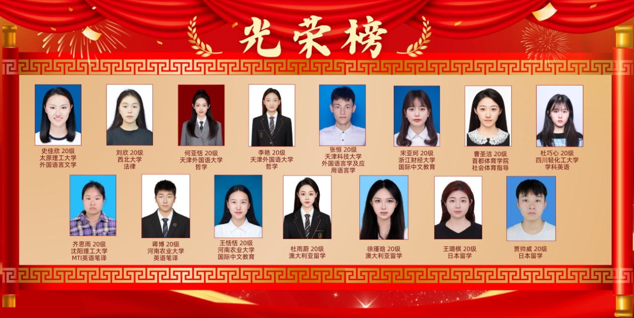 金榜题名,不负“研”途,随着2024年全国硕士研究生招生录取工作结束,外国语学院升学学子喜讯频传。截至目前,外国语学院2024届学生共有15人升学,升学率达8.38%。其中11人考取研究生、4人境外留学,包括西北大学、太原理工大学、天津科技大学、天津外国语大学、莫纳什大学等国内外知名高校。