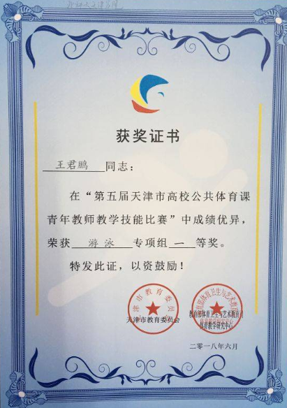 来自包括南开大学、天津大学等28所院校215名青年体育教师参加了本届赛事。比赛共分四个项目(体能测试、教学设计、运动技术、录像课),我院体育部派出陈富成老师(在第3届赛事获得过一等奖)为领队,带领王君鹏、李航两位青年老师参加了本届大赛。经过两天的比赛,他们在四项比赛中充分显示扎实的专项技术功底、优秀的课程设计能力以及良好的体能,赢得了评委的赞誉,获得大赛一等奖和优秀组织奖。在展示自己才华的同时也为天津学院争得了荣光。