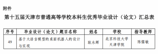 近日,天津市教育委员会公布了第十五届天津市级本科生优秀毕业设计(论文)评选结果,我院信息工程学院陈儒敏老师指导、2024届毕业生耿永辉完成的毕业设计《基于大语言模型的桌面机器人的设计与实现》荣获天津市级本科生优秀毕业设计(论文),获奖信息如下: