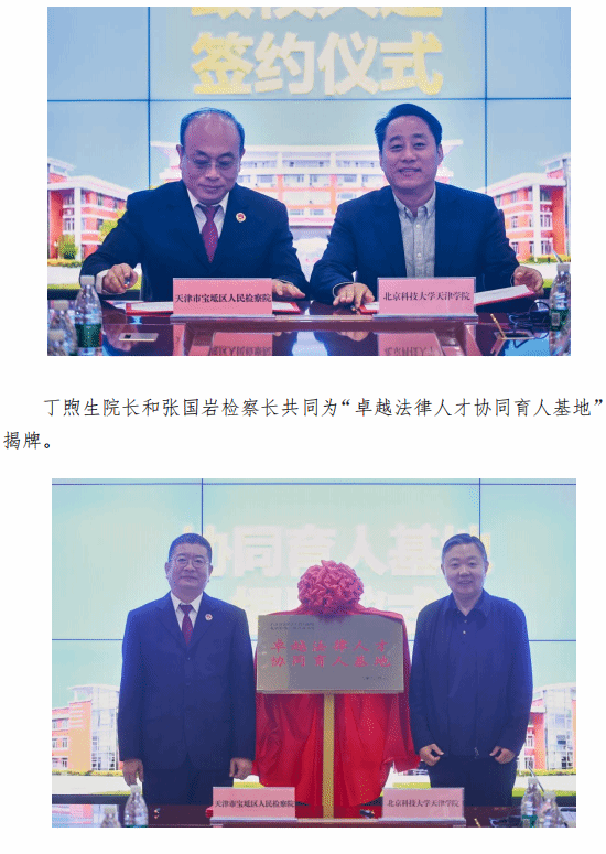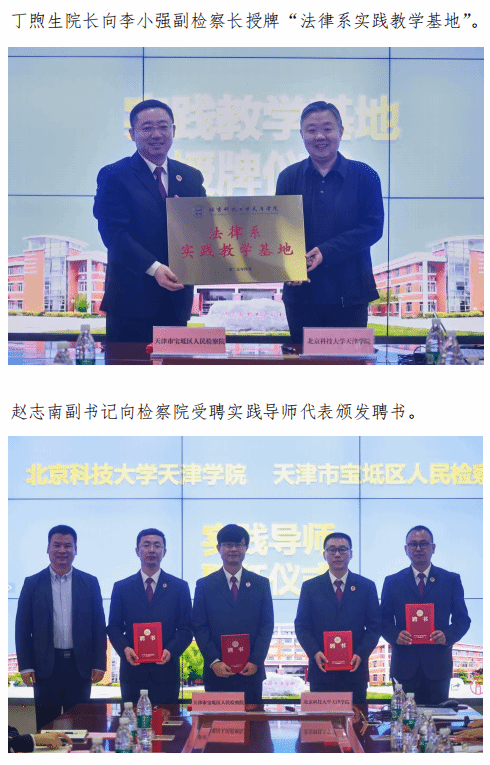 2025年4月8日上午,我院与天津市宝坻区人民检察院合作共建签约仪式在12教300会议室隆重举行。天津市宝坻区人民检察院党组书记、院长张国岩,院党组成员、副检察长李小强,院党组成员、政治部主任陈国勋,综合业务部主任李祖兴,办公室主任李洋,政治部副主任白雪菲,综合业务部副主任王立忠,办公室副主任王海霞,第三检察部副主任赵伟,第一检察部副主任周德松一行莅临签约现场,我院院长丁煦生,副院长张永锋,党委副书记赵志南,党委副书记郭雅娟,产学研办公室主任彭鹏,学院办公室副主任黄建华以及法律系主任朱京安,常务副主任邢晓晖,党总支书记张莉,实践教学指导中心主任刘国平,法学教研室主任李文一,教师代表董祺、刘少华等出席仪式。
