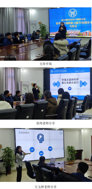 在随后的交流研讨环节,管理学院的邵帅老师与信息学院的赵成老师受邀上台,分享了他们的心得体会及遇到的困惑。高老师还根据与会教师会前提交的收获进行了总结分享,她指出,参加培训的教师普遍认同“把课堂还给学生”的理念,这要求我们不断更新教学理念,研究教育教学,提升教学能力,构建师生共同体,实现同学、同研、同讲、同行的目标。