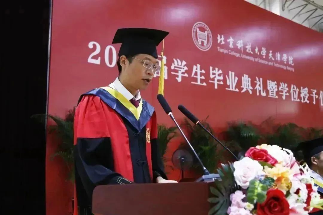 材料与环境学院刘天驰代表全体毕业生发言,他表达了对未来的憧憬、对过去四年青春的炙热回忆,向母校、父母和师长致以衷心的感谢与最真诚的祝福。
