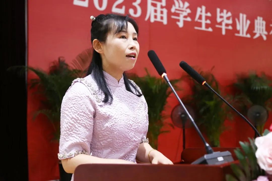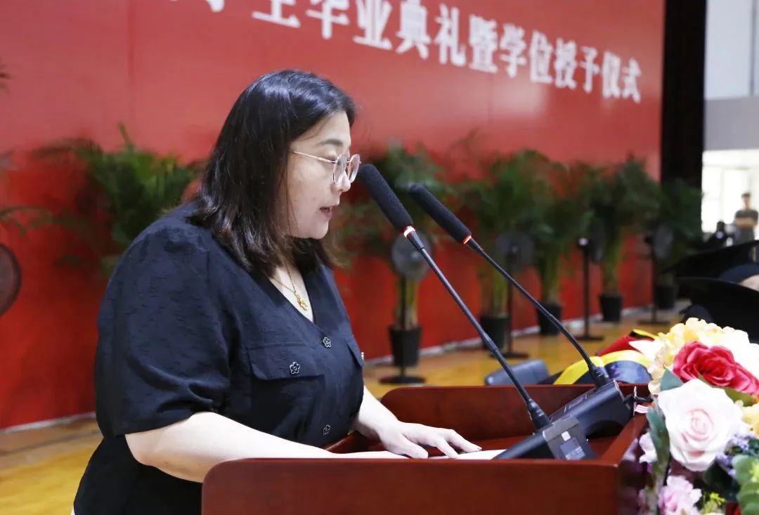 法律系李姝霖家长李娜女士作为毕业生家长代表发言,她感谢了学院与老师们的悉心栽培和鼓励,希望同学们饮水思源,勿忘师恩,鼓励同学们做自己尊重的人,呼吁同学们铭记习近平总书记对青年的嘱托,立志做有理想、敢担当、能吃苦、肯奋斗的新时代好青年。