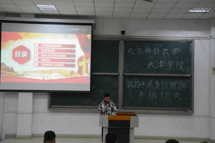 为进一步贯彻落实学院征兵工作要求,主动适应征兵工作新形势,着力推动我院征兵工作高质量发展,11月19日下午北京科技大学天津学院2022年兵员预储班开班仪式在9教108举办,宝坻区武装部军事科参谋白云鹏、学院武装部副部长周少华、武装部干事李雲啸、刘武辉以及预储班学员200余人参加此次开班仪式。