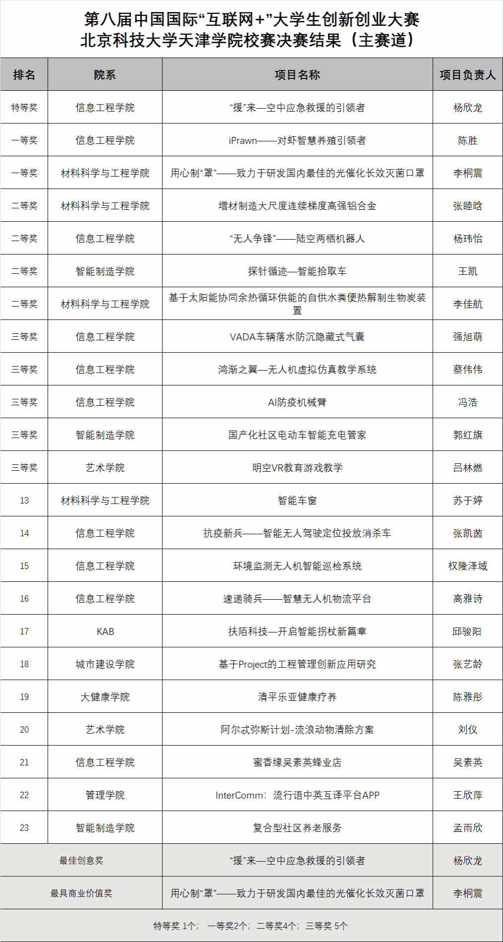 决赛开始后,现场33支创业团队按照抽签顺序向评委介绍展示各自创业项目,评委对项目进展、商业模式、财务状况、团队组建和未来规划等方面进行提问,参赛队员限时回答,之后评委给出分数。经过激烈角逐,评选出主赛道特等奖 1个,一等奖2个,二等奖4个,三等奖 5个;红旅赛道一等奖 1个,二等奖1个,三等奖3个。17个校级优秀项目将择优推荐参加第八届中国国际“互联网+”大学生创新创业大赛天津赛区比赛。
