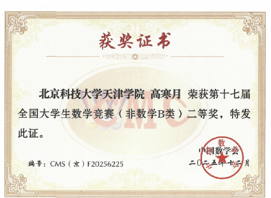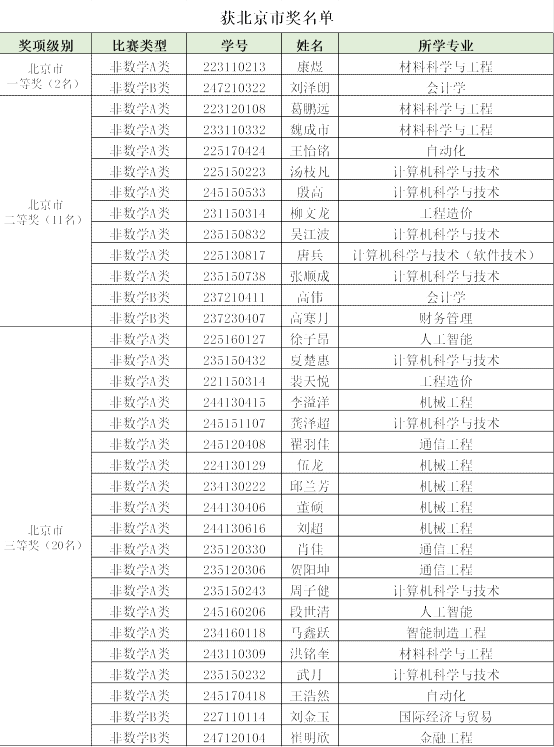 近日,第十七届全国大学生数学竞赛初赛获奖名单公布,我院学生在本届竞赛中表现出色,取得了优异成绩。荣获北京市一等奖2人,二等奖11人,三等奖20人;其中全国二等奖3人,全国三等奖5人。