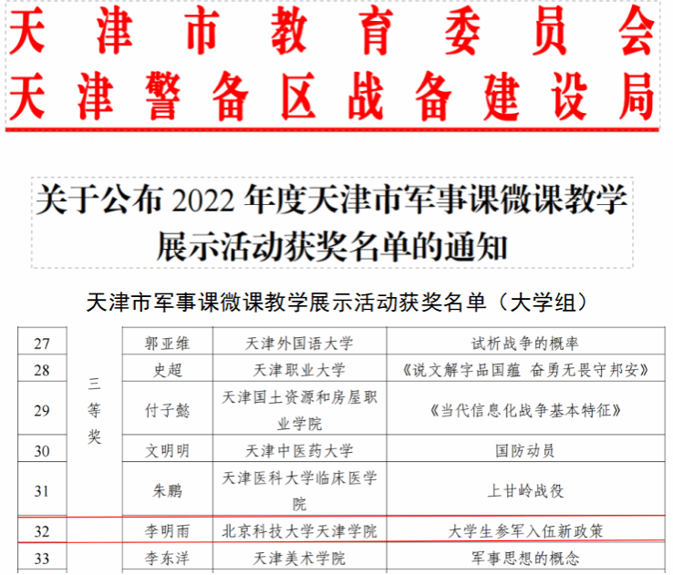 近日,由天津市教育委员会、天津警备区战备建设局主办的2022年度天津市军事课微课教学展示活动成绩揭晓,我院教师李明雨的军事理论课微课展示作品《大学生参军入伍新政策》荣获大学组三等奖。 天津市军事微课...
