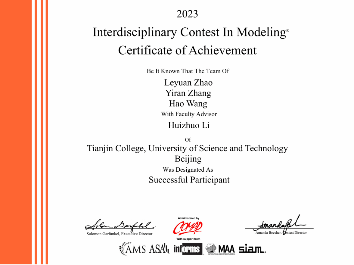 近日,2023年美国大学生数学建模竞赛和跨学科建模竞赛结果今日公布,全球有21858个队参加了本届竞赛,由我院智能制造学院物流2101班的赵乐缘、通信2101班的王浩,外国语学院英语2104班的张艺冉组成的团队,在外国语学...