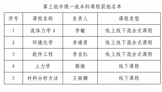 近日,天津市教育委员会发布《市教委关于公布第三批天津市一流本科建设课程名单的通知》,我院共有5门课程获批第三批市级一流本科课程,分别为:《流体力学A》《环境化学》《软件工程》《土力学》和《材料分析方法》...