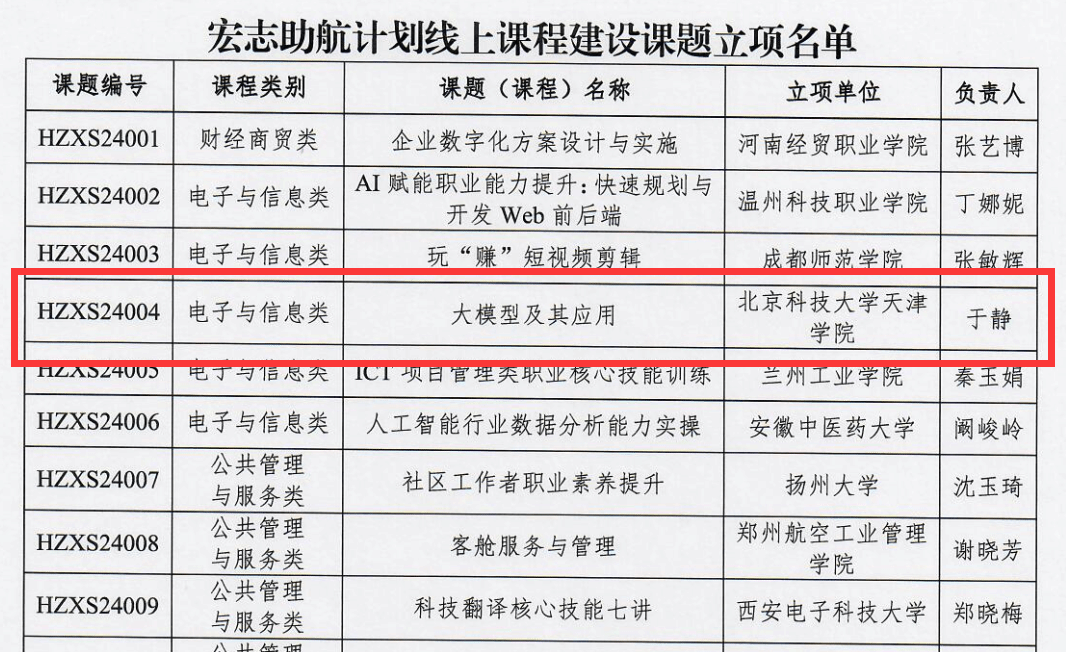 近日,教育部学生服务与素质发展中心公布“宏志助航计划”线上课程建设课题立项名单,由信息工程学院副院长于静教授主持申报的《大模型及应用》课程获批立项,为我校首次获得该项目立项。项目组成员来自无人系统与具...