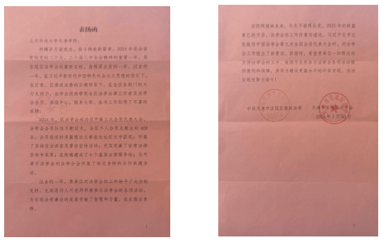 近日,我院收到了来自中共天津市宝坻区委政法委、天津市宝坻区法学会的表扬函,对我院在法学研究、法治人才培养以及法律系教师积极参与区委政法委、区法学会各项工作所做出的突出贡献给予高度赞扬。 2024年,我院教...