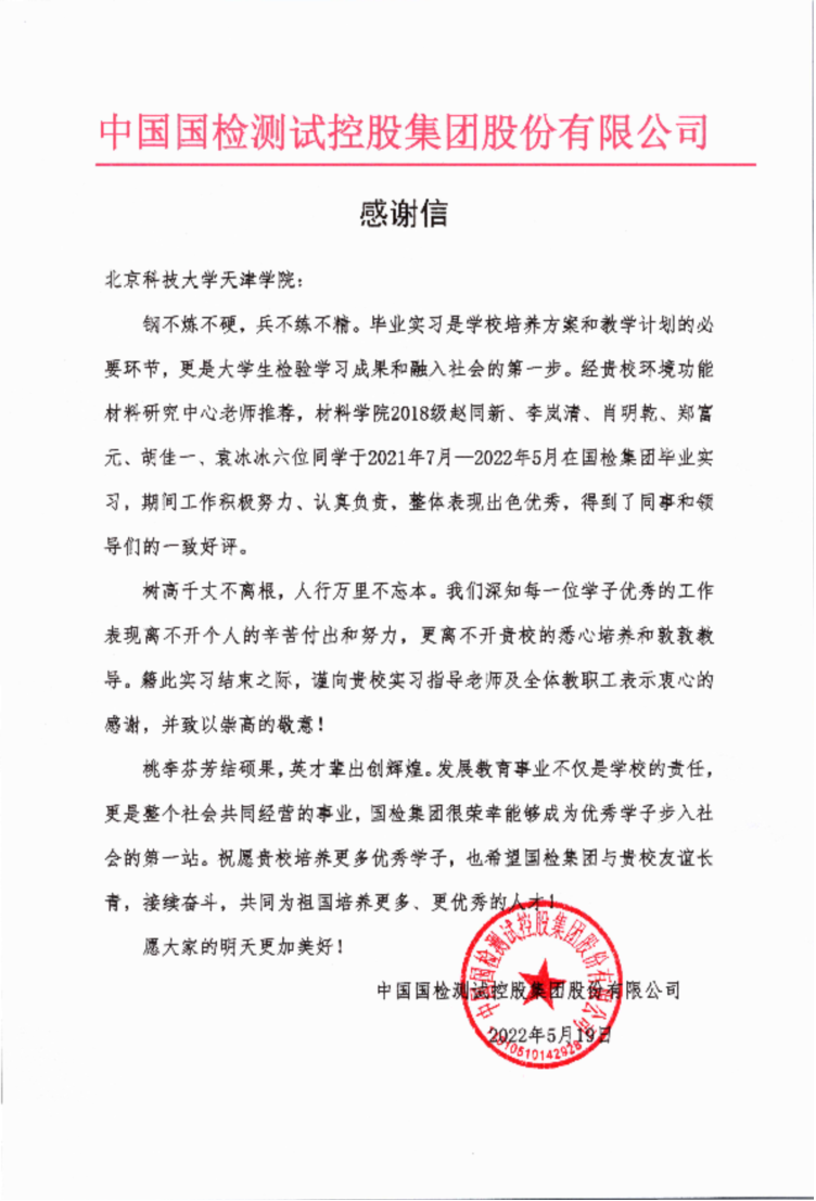 5月19日,我院收到来自中国国检测试控股集团股份有限公司(国检集团)的感谢信,信中对我院材料系六名在该集团参加毕业实习学生的优秀表现给予了高度评价,对学院的应用型人才培养模式给予了积极肯定,对学院老师们表...