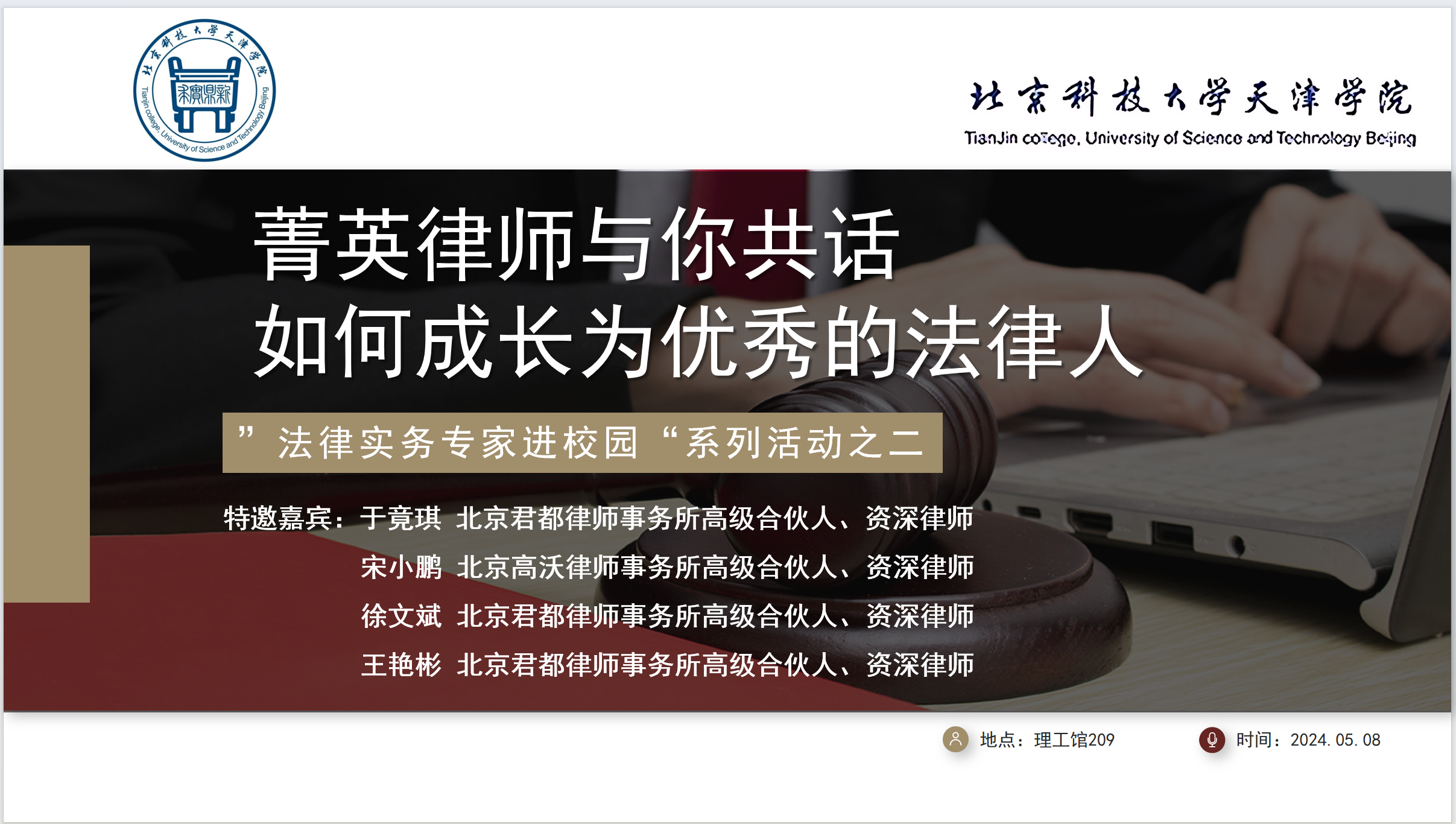 5月8日15时,法律系“法律实务专家进校园”第二期活动在理工图书馆209成功举办。本期活动以“菁英律师与你共话--如何成长为优秀的法律人”为主题,特邀北京君都律师事务所高级合伙人、资深律师、我院兼职教授于竞琪,...