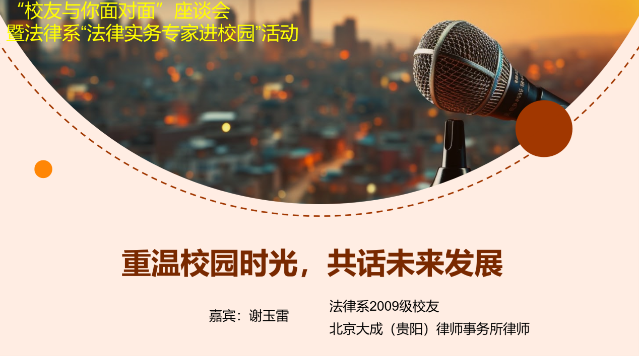 2024年4月18日下午,法律系2009级校友、北京大成(贵阳)律师事务所谢玉雷律师回访母校。校友会办公室和法律系在理工馆209室联合组织“校友与你面对面”座谈暨“法律实务专家进校园(第一期)”活动,邀请谢玉雷校友...