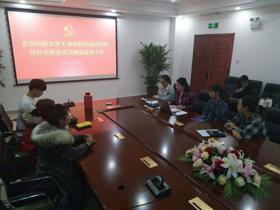 经北京科技大学天津学院党委批准,外国语学院党总支部于2019年12月18日召开全体党员大会,举行外国语学院党总支部委员会换届选举工作。北京科技大学天津学院学术委员会主席宋存义同志、外国语学院院长张国敬同志出席...