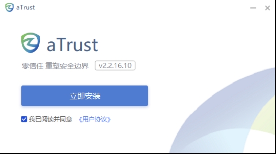 用户双击打开名为aTrustInstaller的客户端软件,在软件安装界面查看用户协议后,勾选“我已阅读并同意”后点击安装界面的 “立即安装”按钮,开始安装。