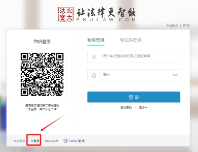 VPN登录成功后,访问https://www.pkulaw.com链接,用户以学院用户的身份,使用北大法宝法律法规和司法案例资源。