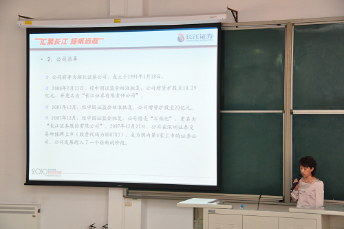 随后,天津证券天津公司行政总监杨静女士为大家作了关于校园招聘的宣讲会。宣讲会包括对长江证券的总体情况、职工薪酬以及校园招聘流程三个方面的详细介绍。