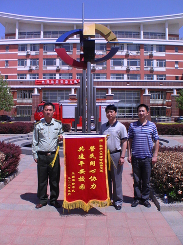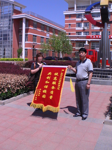 副处长董朋山代表保卫处接受九园消防中队赠送的 “警民同心协力,共建平安校园”的锦旗及学院超市负责人赠送的“提高服务质量,共创和谐校园”的锦旗。