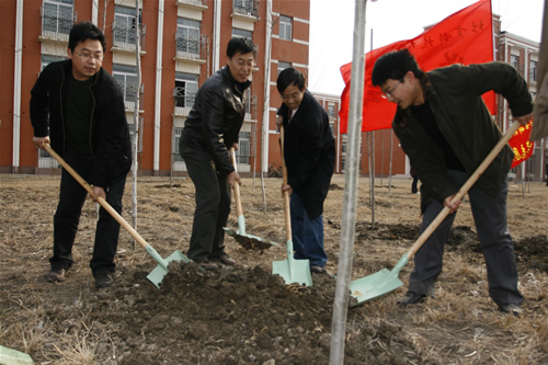 3月上旬,在我国第32个植树节来临之际,学院团委在校园东区举行北京科技大学天津学院2010年度植树活动。院长郭景文、党委书记王斌、副院长曹连东、学院办公室主任白亮、体育部主任吴铁桥、基建后勤处处长王兴元出席了活动。