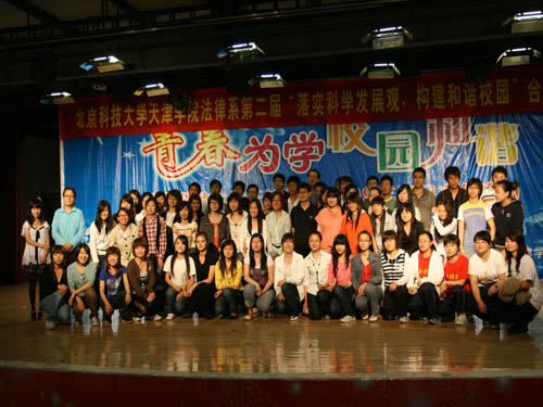 5月14日,“落实科学发展观,构建和谐校园”法律系第二届合唱比赛”在我院活动中心二楼隆重举行。法律系党总支书记代鸿滨、艺术教育中心主任李坤、团委副书记李静雯、各系分团委书记及老师担任比赛评委。此次比赛由法律系分团委主办。