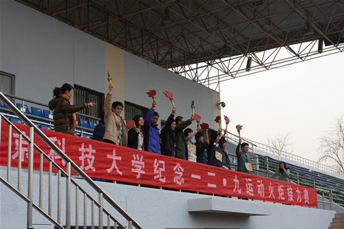 为纪念“一二·九”学生运动,培养学生爱国主义精神,贯彻落实学生阳光体育运动,加强各学院之间的团结和友谊,在校本部体委的精心策划、组织下,12月9日下午4点,在校本部田径场隆重举行了“一二·九”火炬接力赛。由11名师生运动员代表组成的我院代表队参加比赛并最终取得第三名的佳绩。