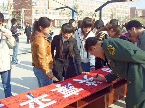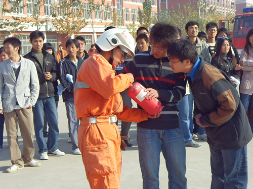 仪式结束后,宝坻消防支队28中队消防战士和消防志愿者在一斋宿舍区进行了实地消防演习。工作人员模拟火灾现场燃起明火,消防人员详细讲解我院现有消防设施的使用方法,进行了实战灭火的演练操作和火场逃生演习。从发出指令到师生疏散逃生,最后到消防官兵进行灭火,整个过程一气呵成,达到了预期目的。消防演习后,机械系组织学生开展了“关注消防、珍爱生命、共享平安”签名活动。