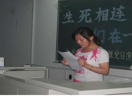 “汶川,汶川,你听到了吗?我是唐山,我是唐山。”“不向灾难低头,我们共度难关”机械系物流072班的胡雅楠和齐天卉在讲台上深情地演讲。5月22日,北京科技大学天津学院第三期学生业余党校八班在八教举行了“生死相连,我们在一起”主题党日演讲比赛。机械工程系分团委书记、学生业余党校八班班主任张会宾、机械工程系分团委副书记马祯、黄容,求是分会长顾寕,机械工程系文体部部长危岩出席并兼作评委。