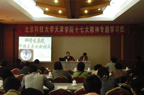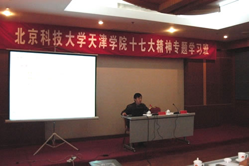 为学习贯彻党的十七大精神,落实科学发展观,强化学院干部工作能力,按照学院党委要求,我院举办了十七大精神专题学习班。继11月29日北京科技大学党委书记罗维东教授作十七大辅导报告之后,11月30日、12月1日两天,学院继续进行院、处级十七大精神专题学习班的学习。