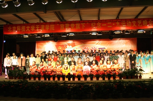 12月6日,“放歌党旗下”纪念一二•九运动文艺晚会在活动中心二楼举行,晚会由我院团委主办、学生艺术团承办,北京科技大学天津学院党委书记、副院长王斌教授、综合办公室主任李帅、学生事务部主任盛佳伟、学生事务部副主任、团委书记叶振楠、经济系党总支书记范丽丽、信息系党总支书记柯瑜、机械系党总支书记郭雅娟、土木系党总支书记赵琼、法律系党总支书记代鸿滨、团委副书记谢玮、艺术教育中心主任李坤及全院近千名师生代表一同观看了晚会。整台晚会格调高雅、隆重热烈、气势恢宏,以党的十七大与纪念“一二·九”为契机,充分展示了我院师生开拓奋进的精神风貌和昂扬奋发的豪情壮志。