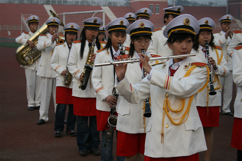 早晨七点,国旗在国旗班成员的护卫下进入学院操场,“奏国歌,升国旗,向国旗敬礼”随着一声令下,学生艺术团管乐团演奏《义勇军进行曲》,在雄壮的国歌演奏声中,鲜艳的五星红旗在数千名师生的注目礼中冉冉升起。